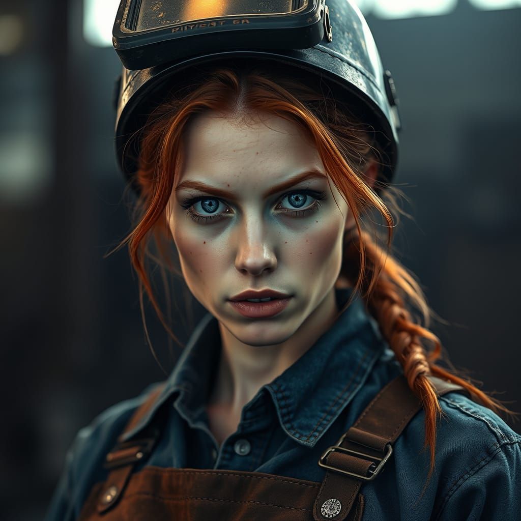 This image captures a strong, blue-eyed redhead, her porcelain skin smudged with welder's marks, still wearing her worn work clothes and leather apron, set against a blurred, atmospheric background that dissolves into a deep, rich bokeh, evoking the moody lighting of cinematic masterpieces.