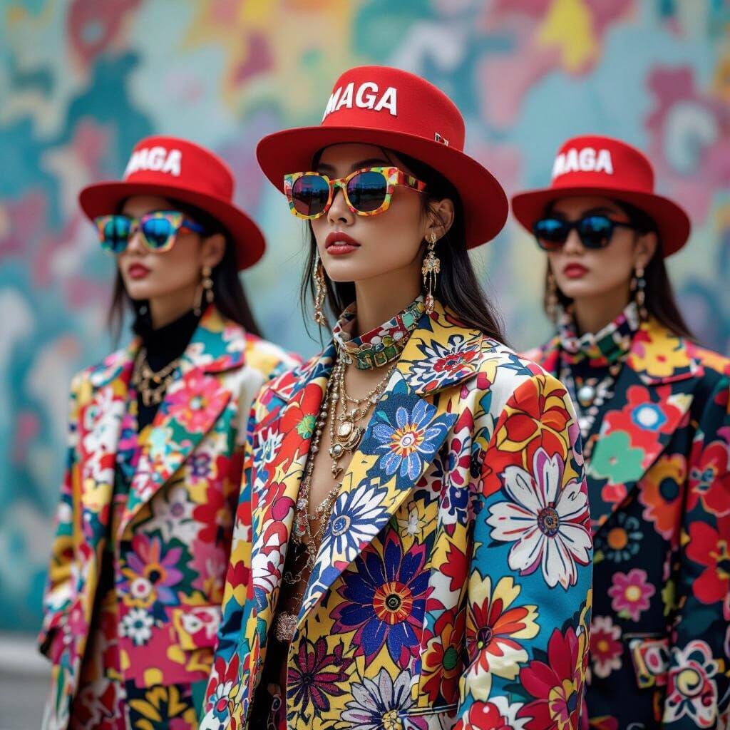 This AI-generated image features individuals in eclectic, colorful attire wearing MAGA hats against an abstract background, reflecting a bold, satirical artistic vision.