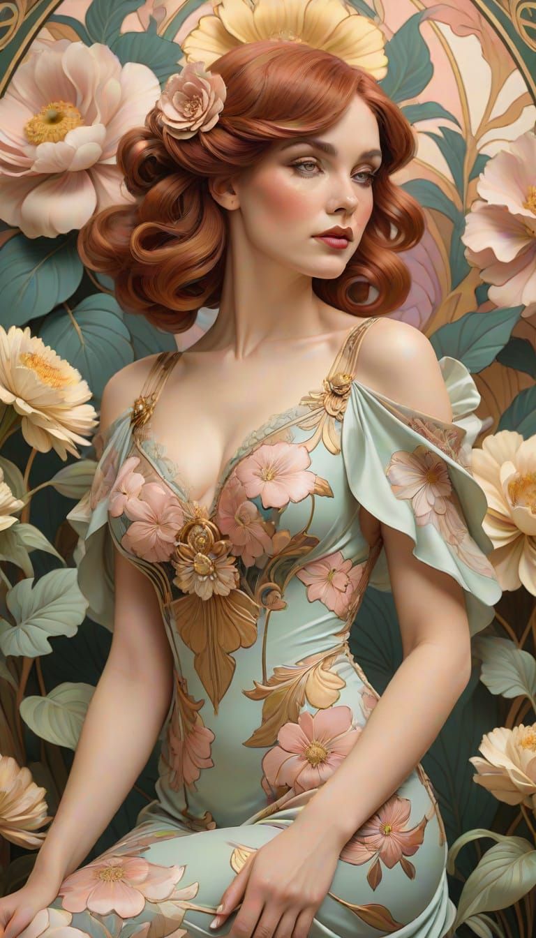A portrait of a pinup model with auburn hair in a vintage dress, surrounded by flowers. The image is rendered in soft pastel colors with gold highlights, as art nouveau.
