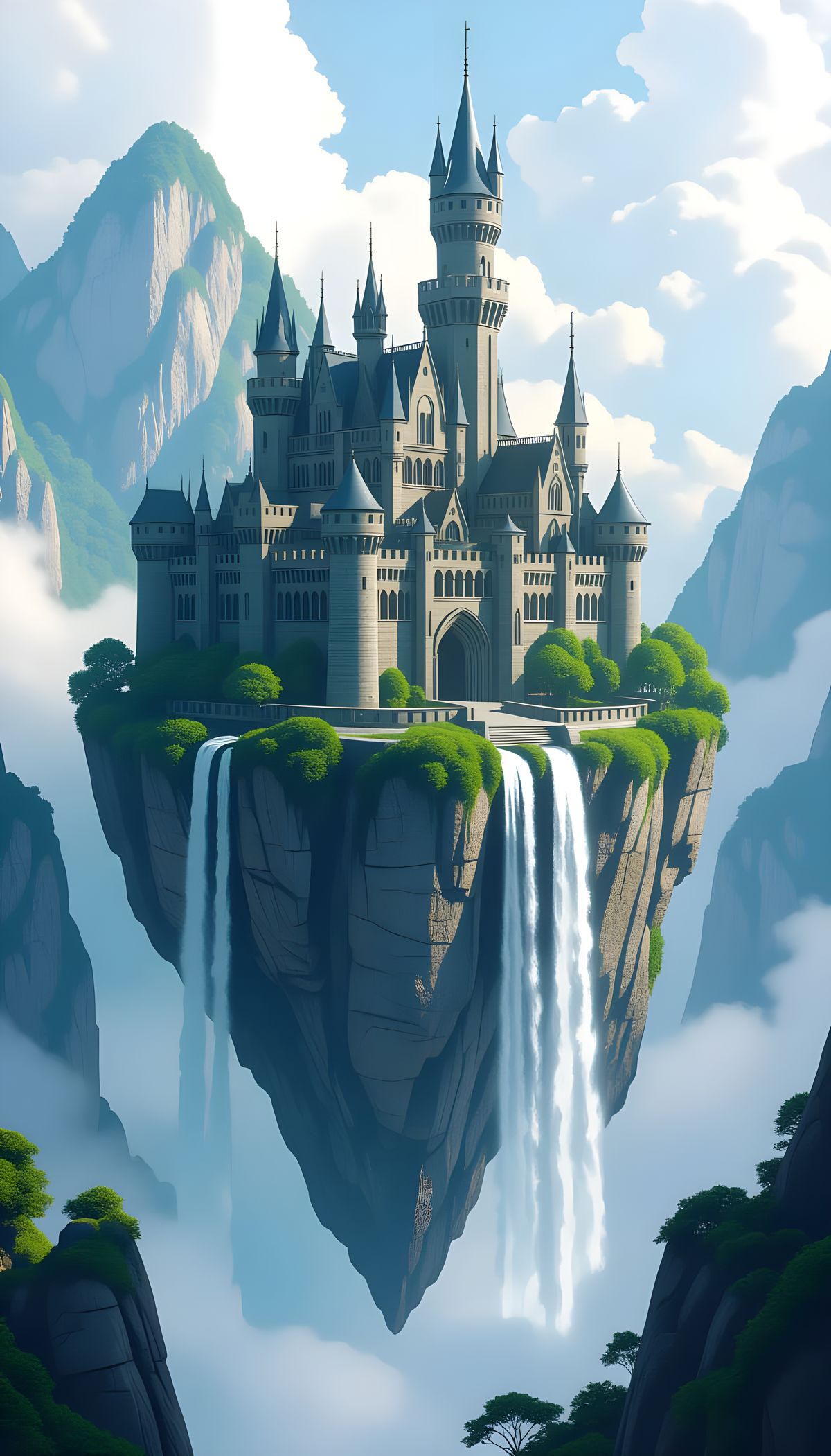 This image shows a grand castle perched atop a huge floating rock island. Waterfalls flow dramatically around it, with detailed architecture and a misty, fantastical atmosphere in high resolution.