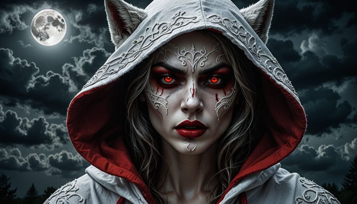 This hyperrealistic image features a woman in a red hood, her face showing signs of a werewolf attack. Vivid red eyes and blood-red lips stand out against a backdrop of a full moon and dark clouds.