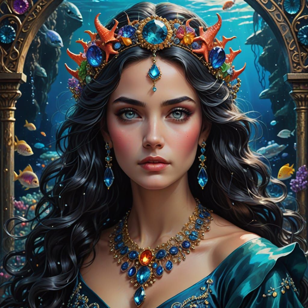 A striking portrait of Kymopoleia, Goddess of Sea Storms, with dark hair and eyes. She wears a detailed, dark-blue silk gown with gems. The vivid, colourful underwater scene conveys beauty and life.