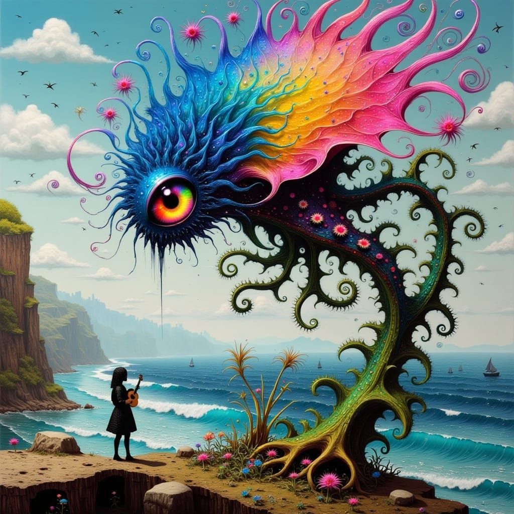 A vibrant seaside vista featuring a fantasy octopus monster leaping from a cliff. This intricate composition blends filigree details, opalescent scales, and a lively scene with musicians and exotic flora in a photorealistic painting style.
