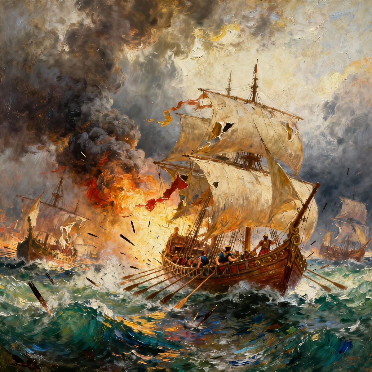 This image depicts a fierce ancient naval battle on a rough sea under a stormy sky. Galleys are shown clashing with dramatic lighting and vibrant colors, rendered in a grand oil painting style.
