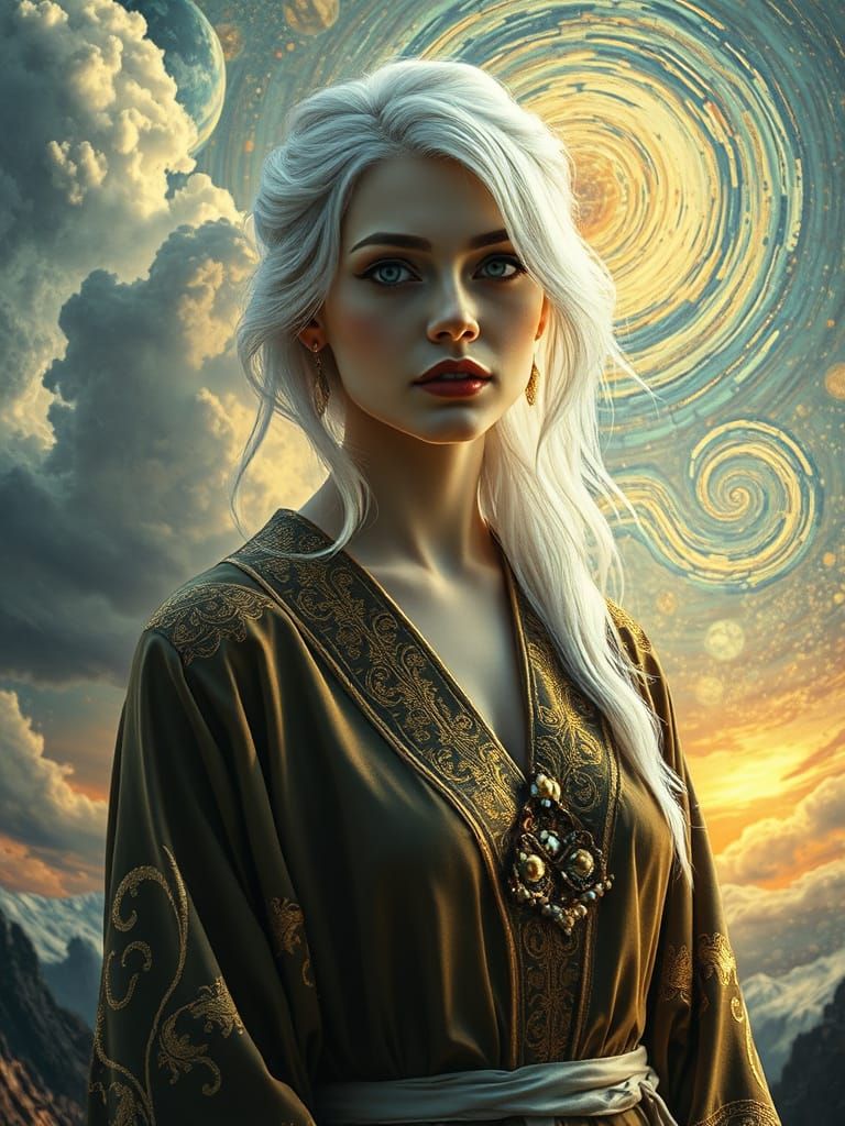 A hyperrealistic portrait of a woman with white hair and luminous skin in a dreamscape. The art blends Klimt's metallic motifs with Van Gogh's swirling skies, featuring moody lighting and gold accents.