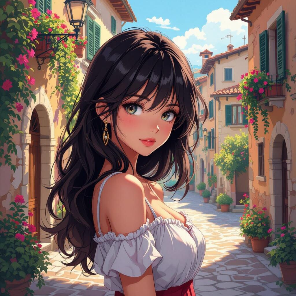 This image shows a beautiful girl with shiny hair posing in an Italian historic town. The artwork features vibrant colors and cinematic lighting, with a cel-shaded, manga-inspired aesthetic.
