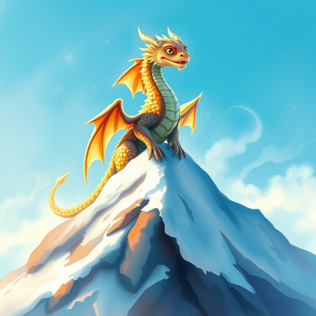 A digital painting of a whimsical dragon sitting on a snowy mountain peak. Swirling mist surrounds the dragon, whose scales shimmer in the sunlight. The fantasy art is rendered in soft pastel watercolors.