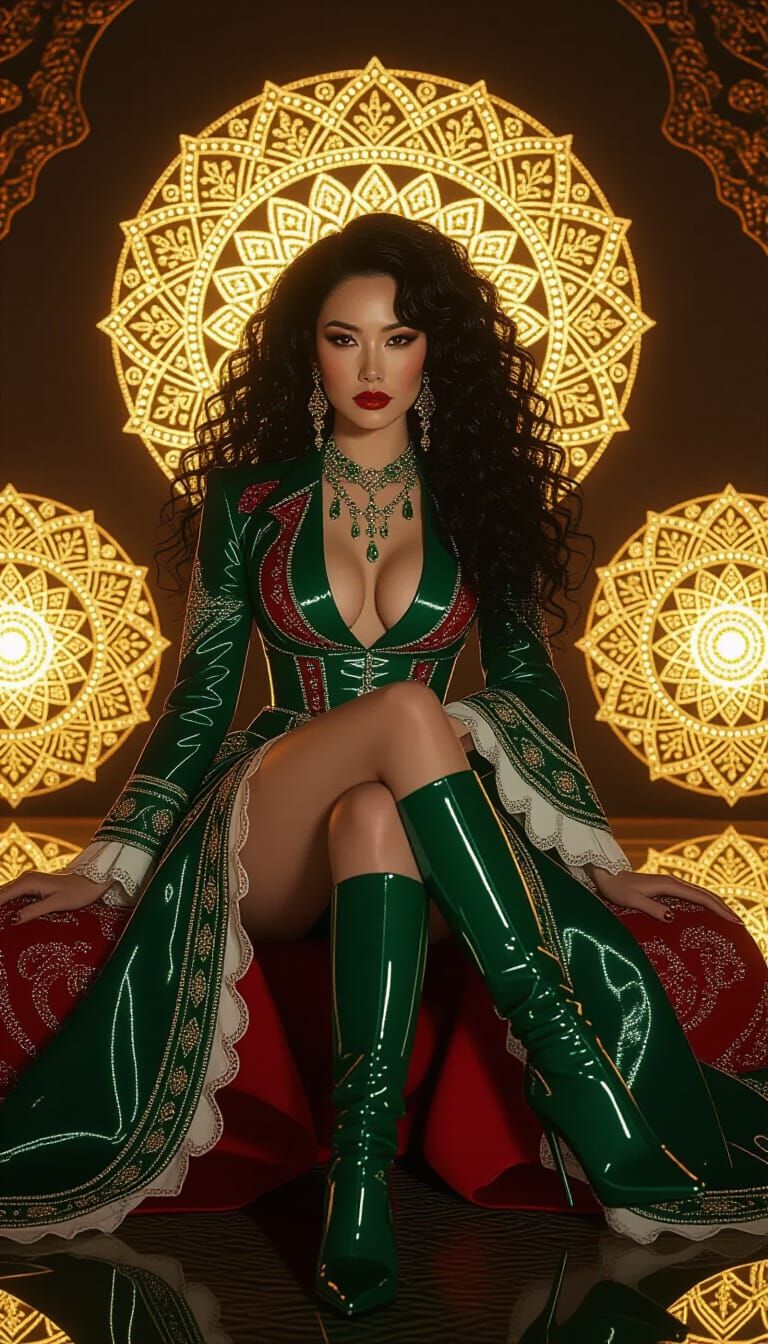 A striking picture of a woman with long black hair and Japanese jewelry. She is wearing a green, red, and ivory outfit and sitting in front of glowing golden mandalas as a hyper-realistic film still.