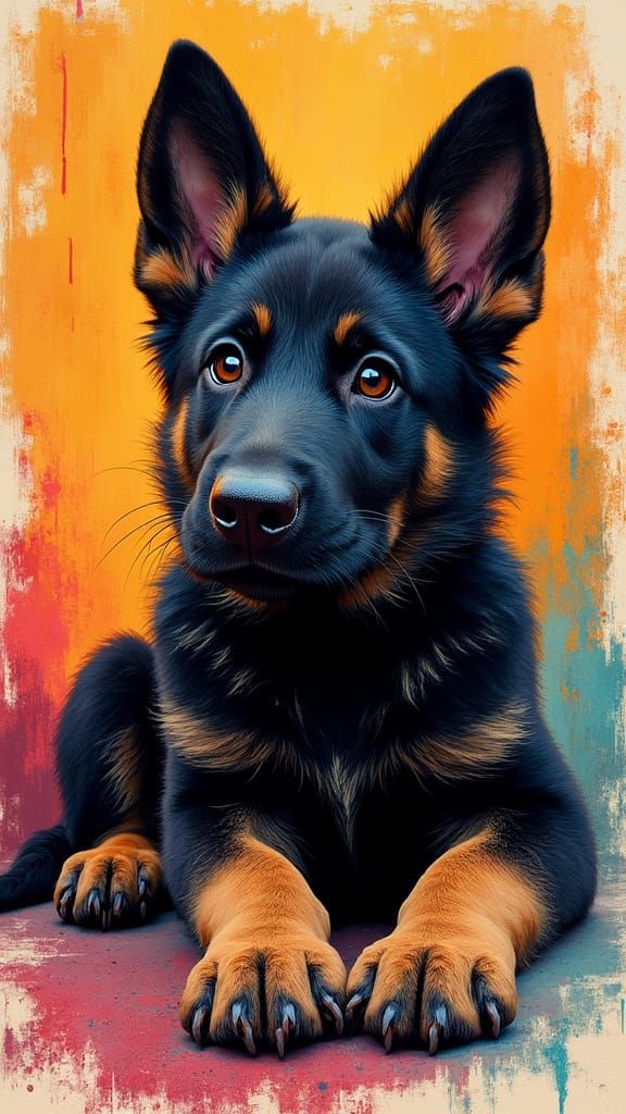 This image depicts a lively scene of black German shepherd puppies set against a colorful background, blending elements of pop art and Art Nouveau in a whimsical and dreamlike atmosphere.