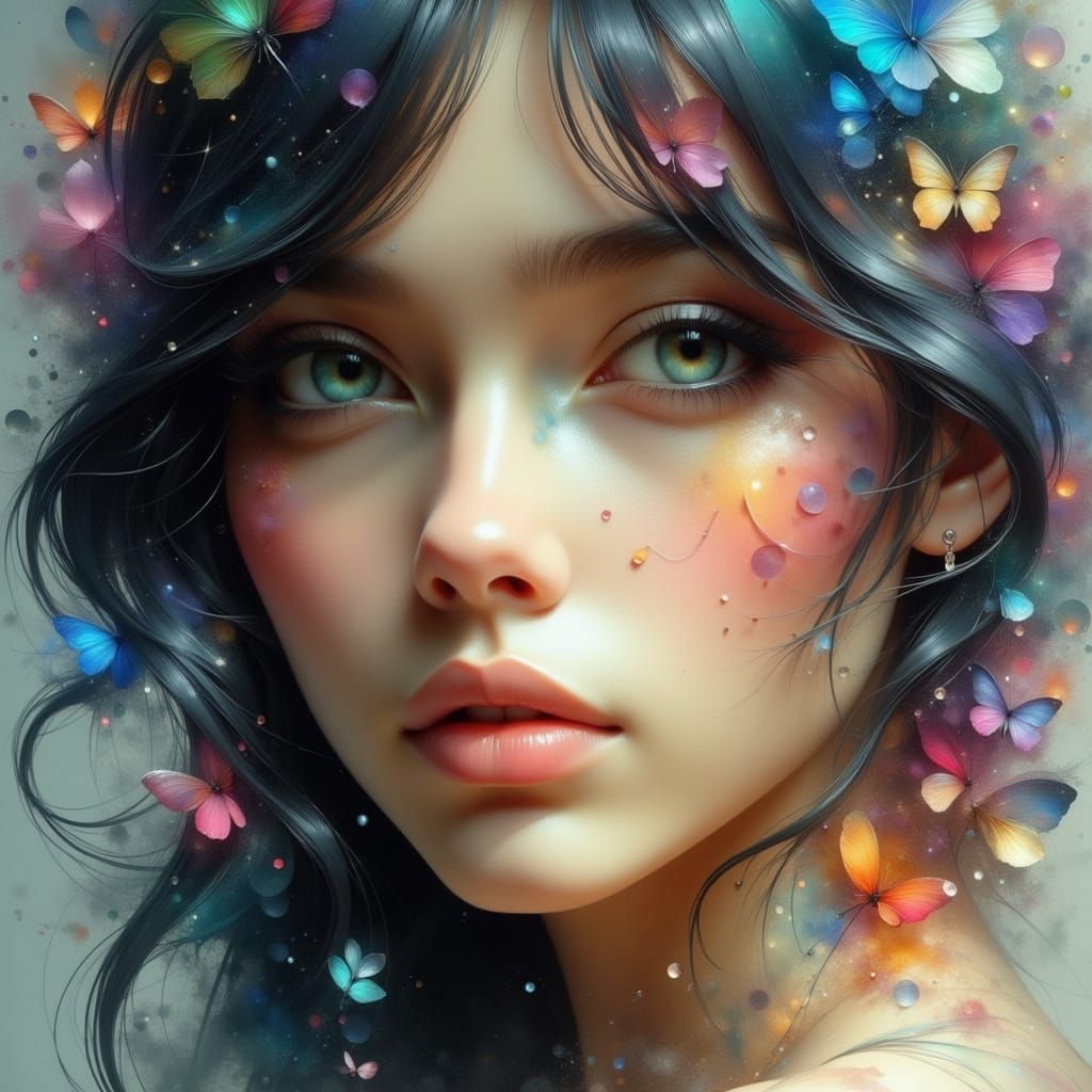 This image shows a striking woman with dark hair and blue-green eyes in soft, dappled light. The artwork has an abstract mixed media style with soft pastel and natural colours.