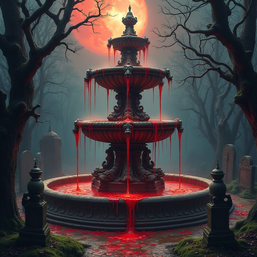 A haunting image of a gothic fountain gushing bright red liquid in a graveyard. The scene is cast in eerie light with twisted trees and Celtic tombstones, in a dark fantasy style.