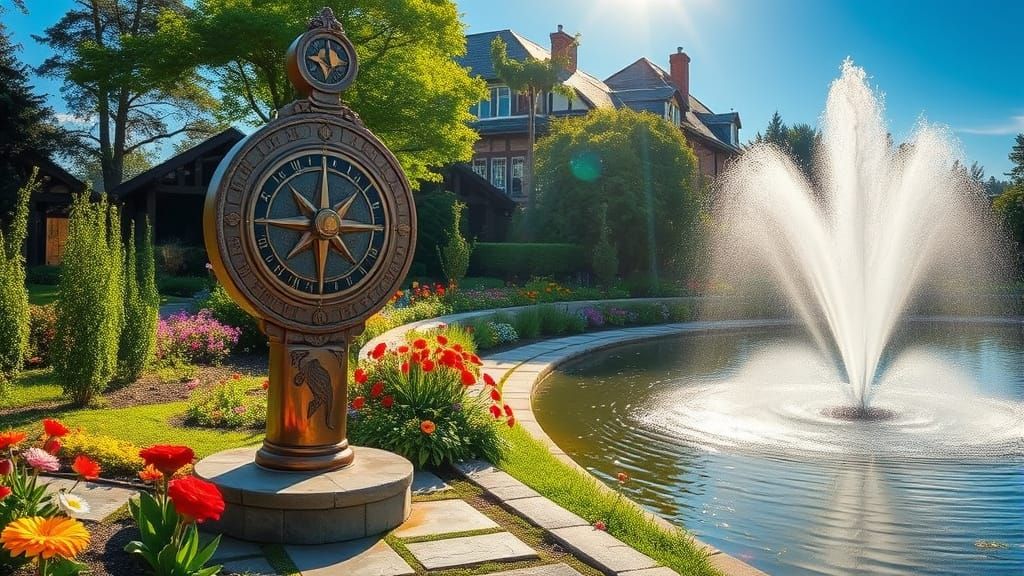 This image shows a beautiful garden scene with a bronze sundial, winding stone path, flowers, and a pond with giant koi fish. Rainbow mist rises from a water fountain on a bright, sunny afternoon.