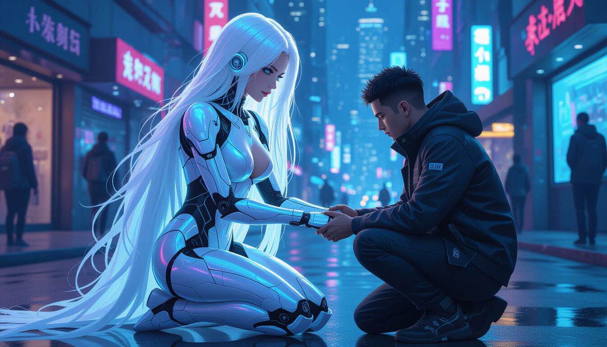This image shows a cyberpunk mech-goddess kneeling to help a homeless man on a futuristic city street. The scene is lit with neon lights and rendered as detailed 3D anime art in a cyberpunk aesthetic.