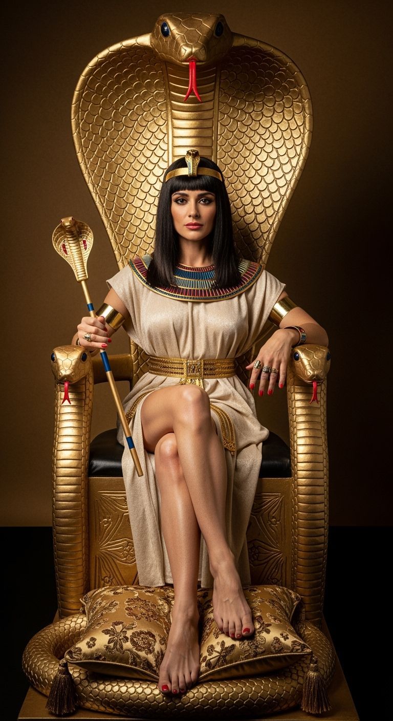 A captivating photograph of an Egyptian queen seated on a golden throne. She is barefoot, adorned in gold, and holds a scepter, all captured with professional photography techniques and natural lighting.