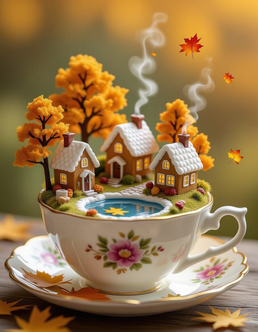 This image shows a charming miniature autumnal village inside a teacup, featuring tiny houses, a pond, and golden trees. Rendered in a whimsical storybook style with hyperrealistic detail and warm lighting.