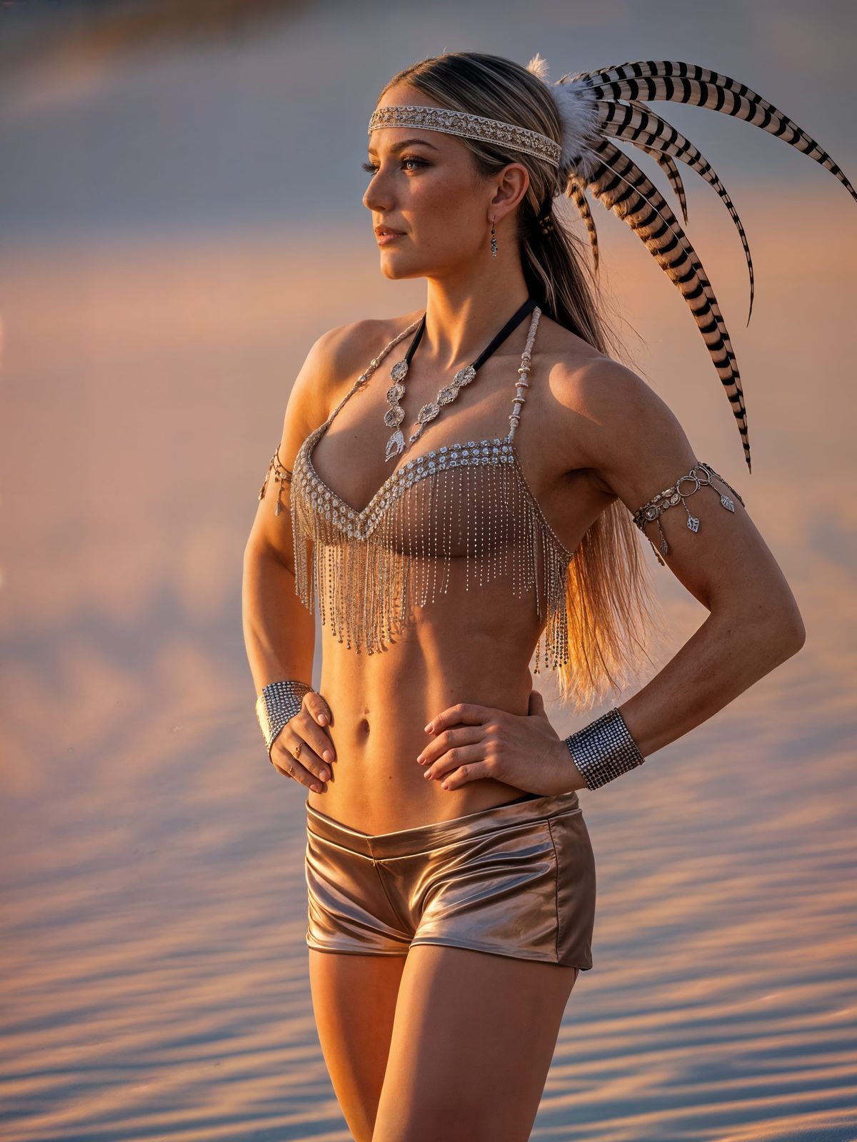 This image captures a stunning woman standing in a sandy landscape, adorned with an elaborate headdress and decorated outfit, radiating confidence and beauty under warm sunset lighting.