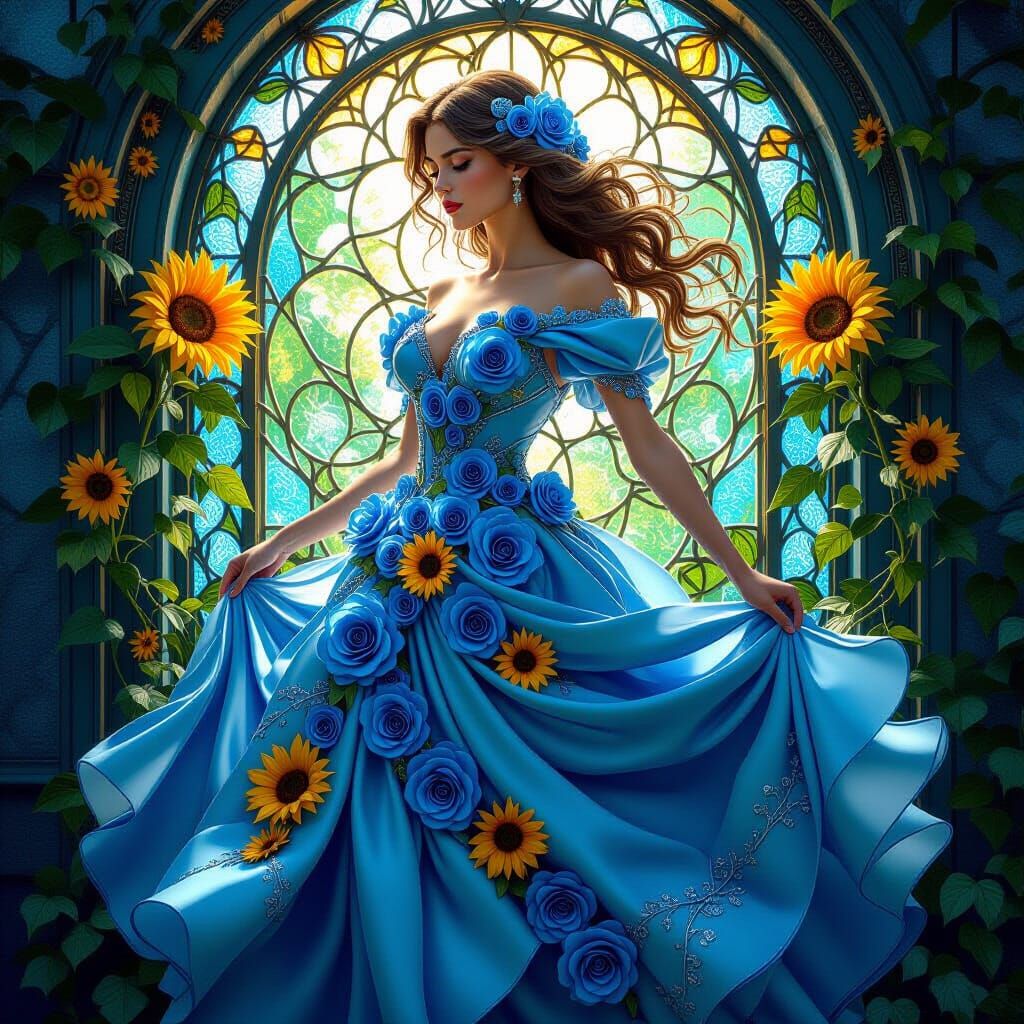 A striking picture of a maiden in a flowing gown of woven blue roses and sunflowers. Silver filigree accents add detail, set against a vibrant stained glass backdrop in a futuristic aesthetic.