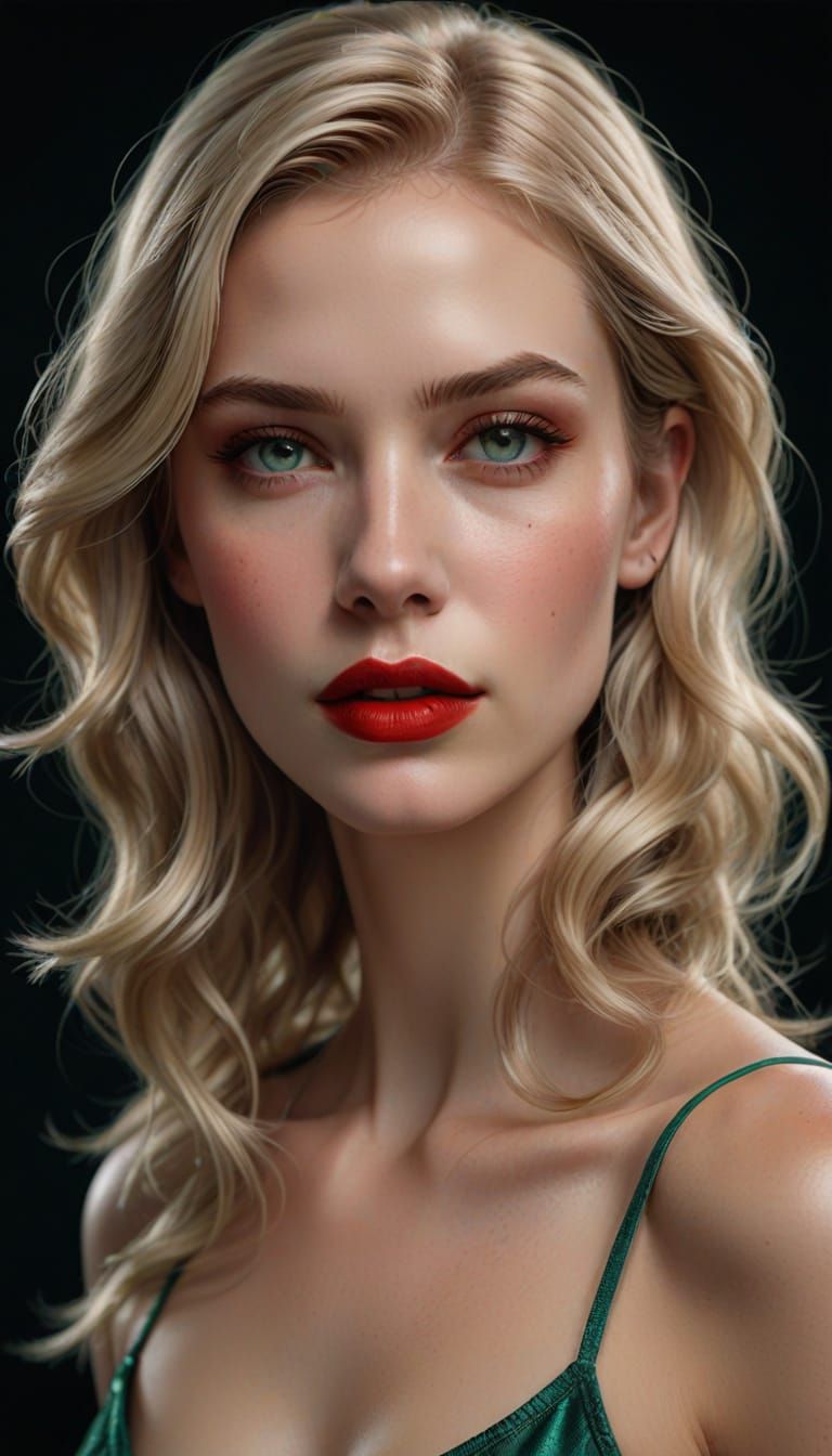 This image showcases a stunning, ultra-realistic digital portrait of a young blonde woman, exuding confidence in a fitted emerald-green bra. Her long, flowing hair and bold red lip color add to her captivating beauty.
