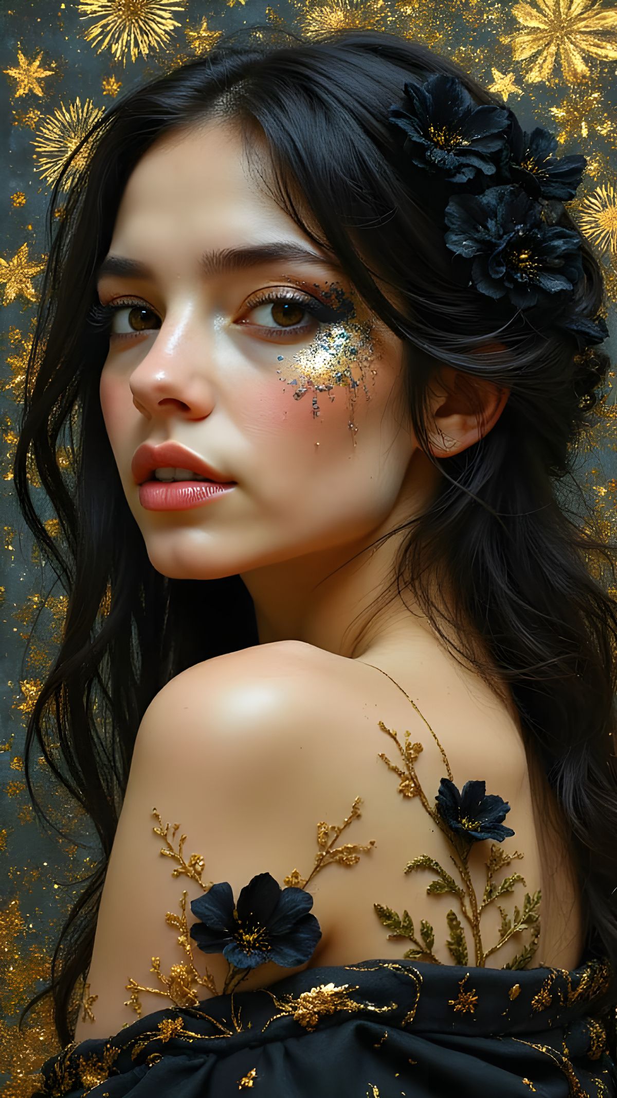 A delicate magical female figure with intricate black flowers in her hair, set against a background of vivid mystical swirling patterns, rendered in a masterpiece-quality art nouveau style with hyperdetailed skin and realistic shadings.