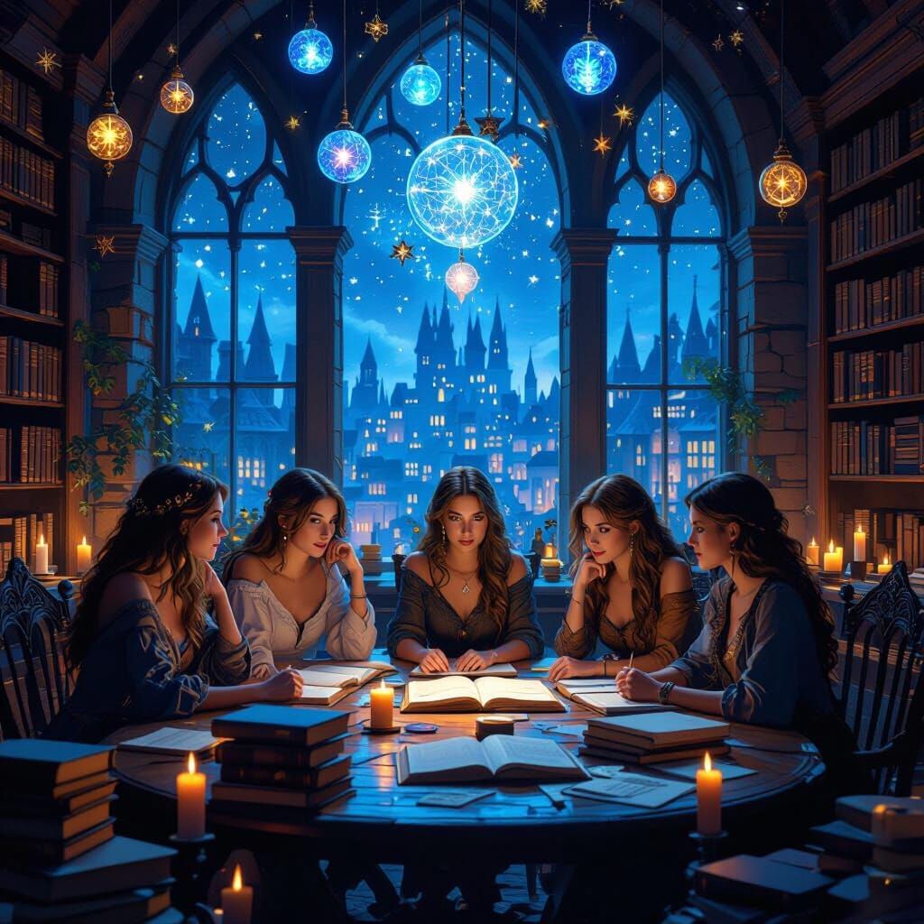 This image depicts five women in a cozy, ancient castle library at night, enjoying a book club. Magical elements and a starry sky enhance the fantastical concept art.