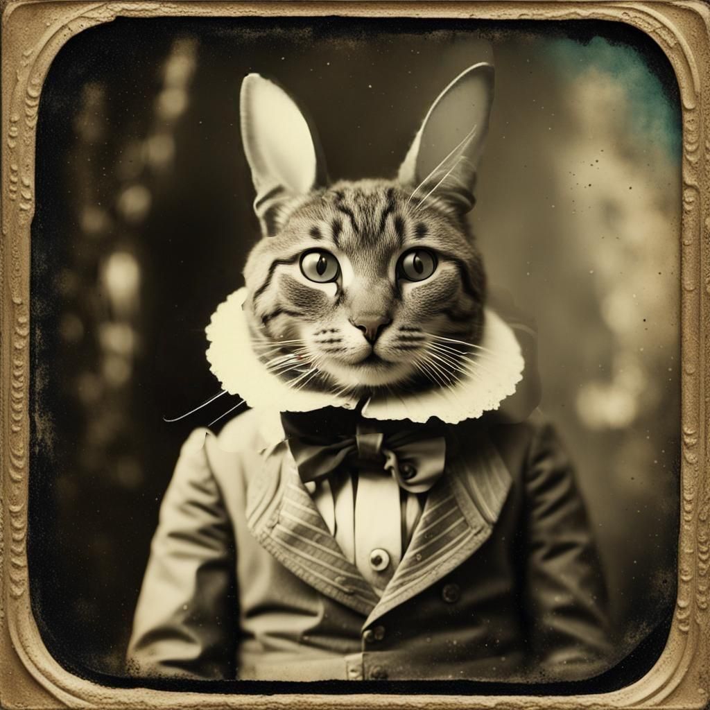 "a tintype photo of a unique, non-copyrighted cat character inspired by the Alice in Wonderland. The cat should be presented in a vibrant color palette and ornate, haunting style, reflecting a blend of mixed media craft and digital disruption. The rabbit's expression should be curious and slightly anxious, contributing to a surreal, whimsical atmosphere. Include subtle digital disruptions and mixed media elements in the cat's design, such as pixelated patches or collage-like textures, ensuring a harmonious blend with the overall dream-like, eerie theme of the tintype photograph."