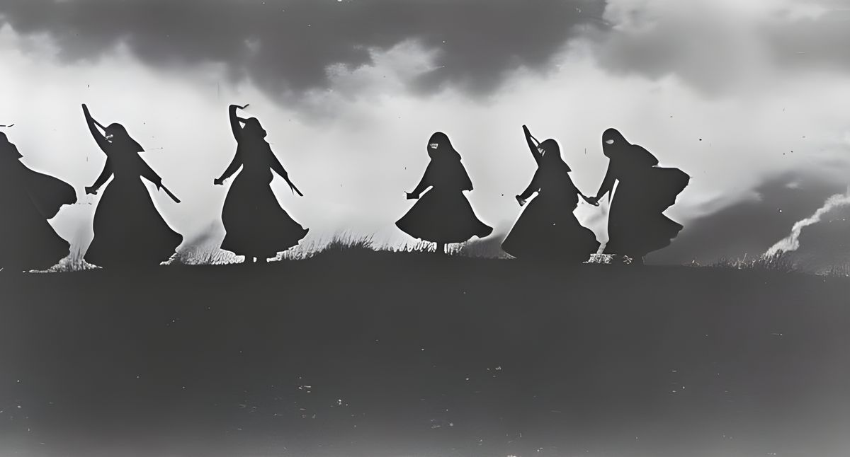 A dramatic image of witches soaring through the night sky. This artwork captures the essence of German Expressionism with its bold lines and emotional intensity.