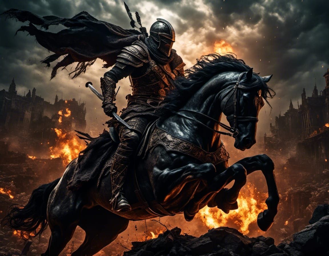 This image shows Ares, the god of war, riding a horse amidst dark skies and lightning. The artwork features a horrorcore, zombie punk aesthetic with detailed and realistic rendering.