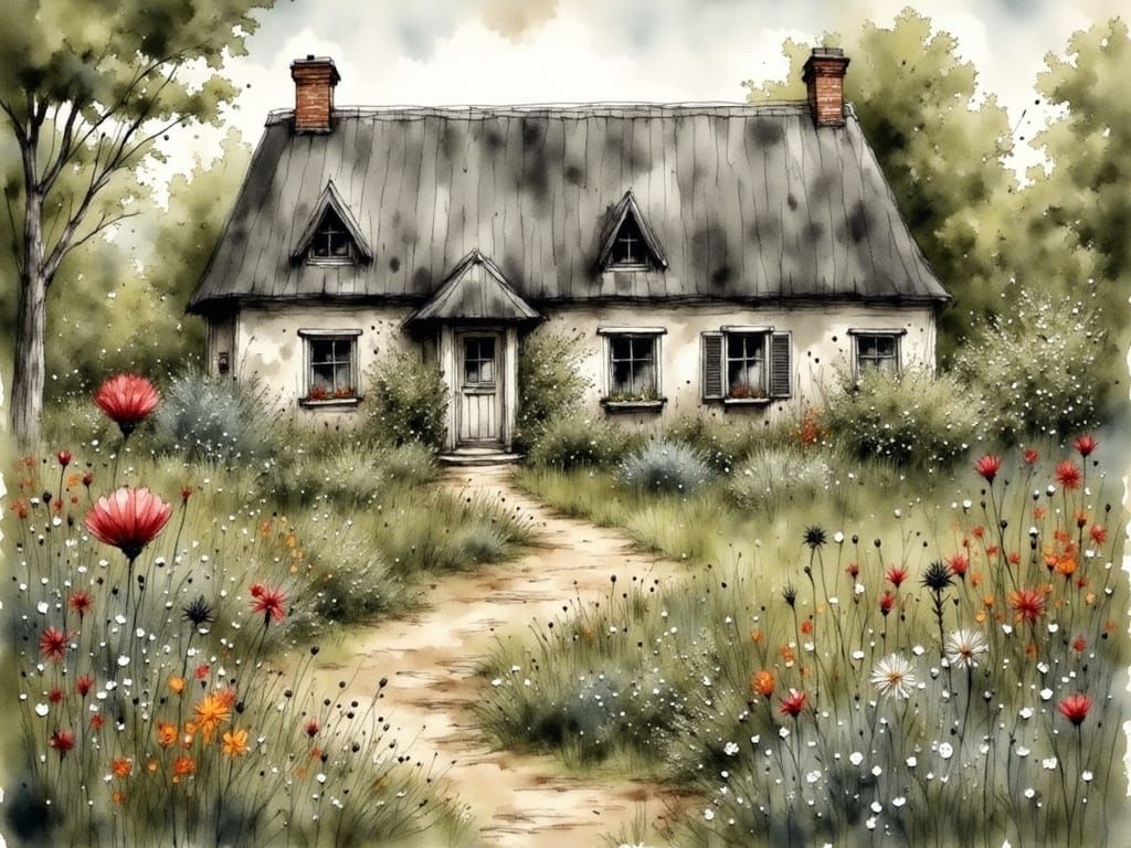 This enchanting image shows a quaint cottage nestled among a tapestry of colorful wildflowers. The intricate details and meticulous design evoke a sense of serene charm.