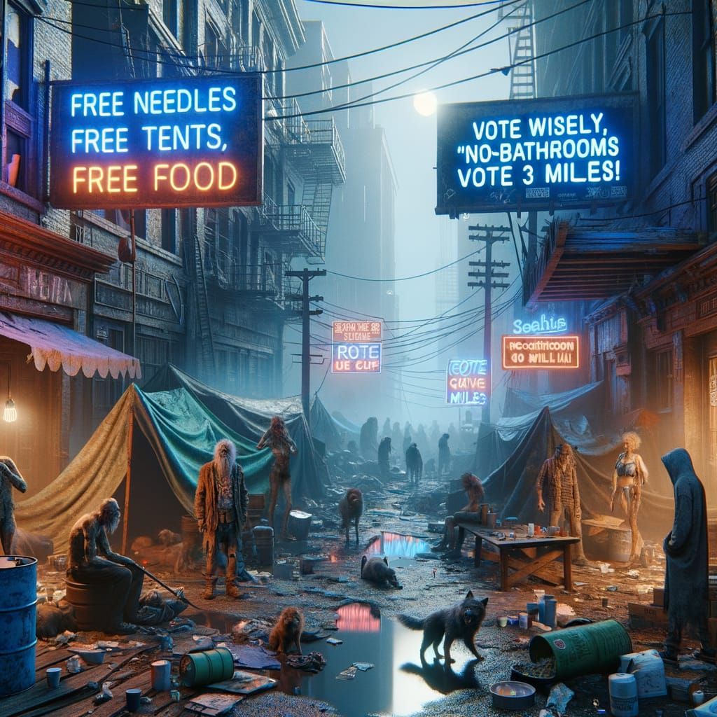 This hyper-detailed 8k image depicts a decaying urban district filled with abandoned buildings, homeless encampments, trash, and stray animals under a full moon's glow.