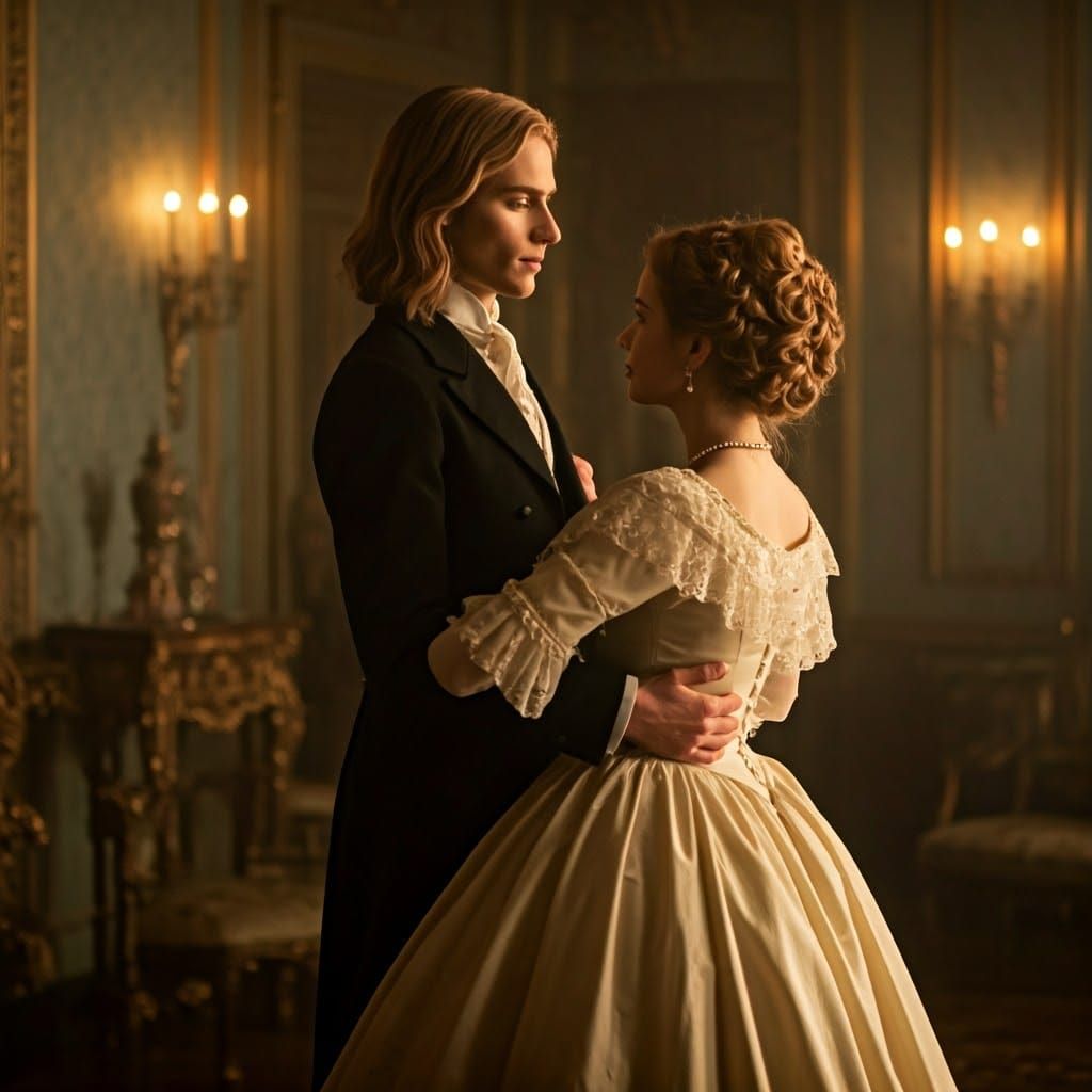 This image shows a young man in a detailed Victorian ballgown dancing with a woman in male attire within an ornate parlor. The scene features cinematic lighting and vivid colors.