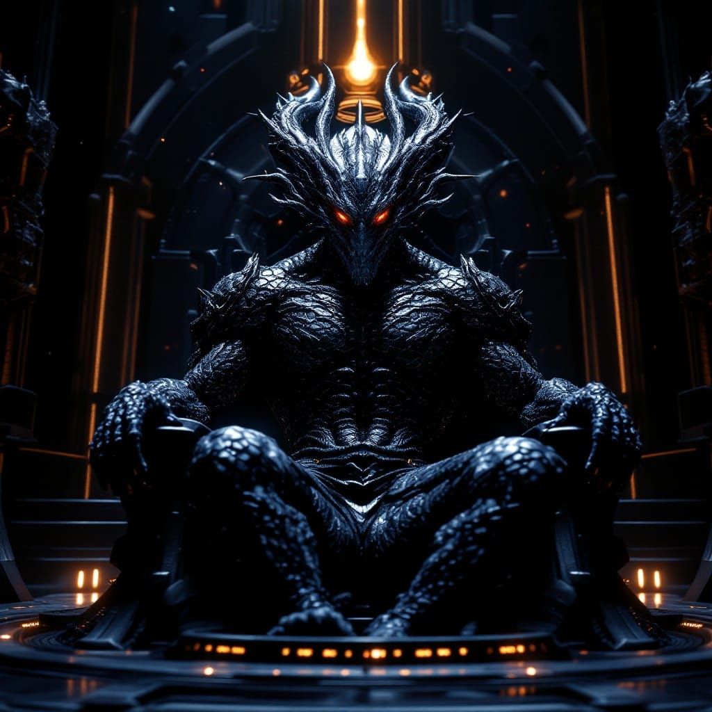 A photorealistic image of a Dracos, a Drakon-Human hybrid with obsidian scales and crimson eyes, seated on a throne within a starship hall. A blue reptilian attends to a holographic interface nearby.