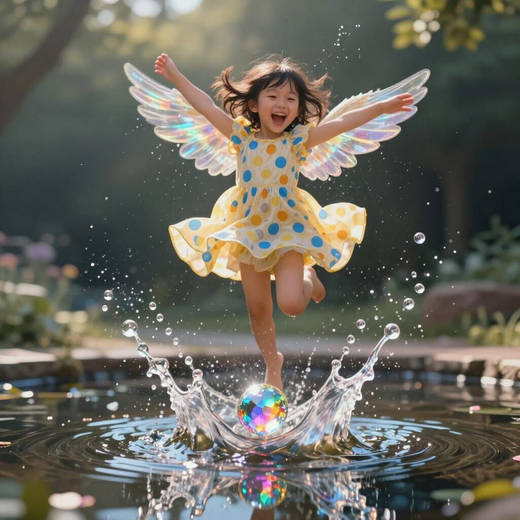 A dynamic image captures a joyful girl frozen in a gravity-defying leap, with her dress billowing and a vibrant splash erupting from the water below.