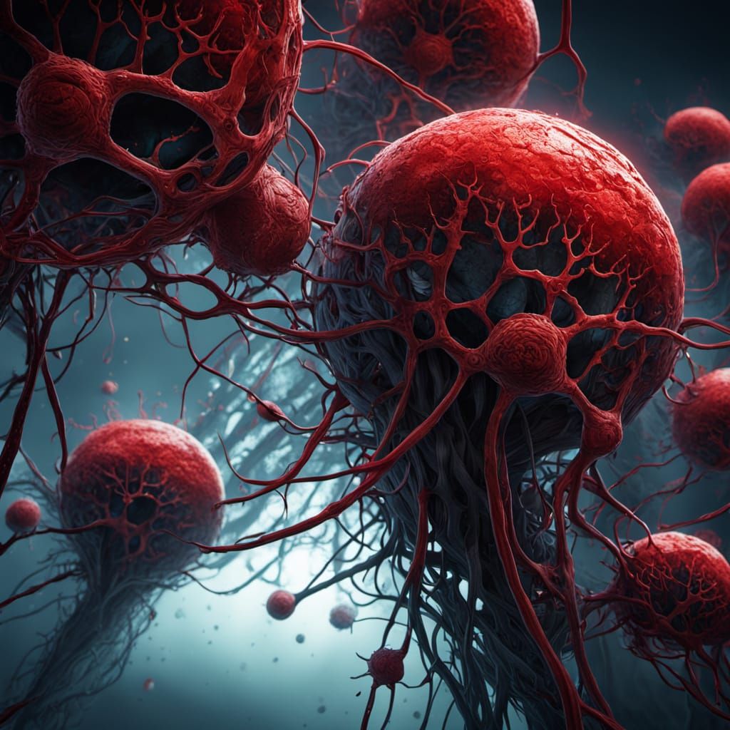 This image shows a macro shot of the inside of a human vein. The dark fantasy style digital rendering features metallic blood cells, glowing DNA chains, and an ominous red glow to create an eerie atmosphere.