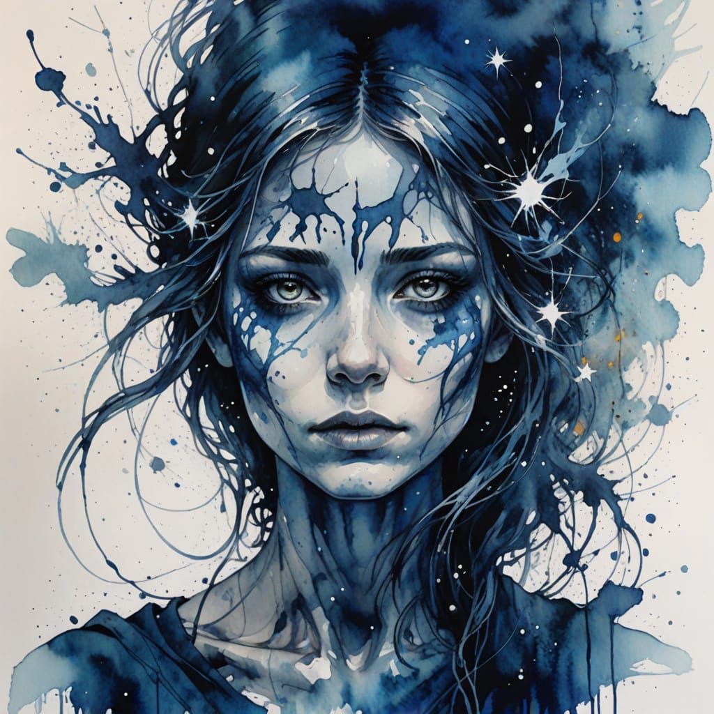 This image shows a haunting watercolor portrait of a lunar spirit with pale skin illuminated by soft moonlight. Indigo ink shadows and star-like splatters create a calm and mysterious mood.
