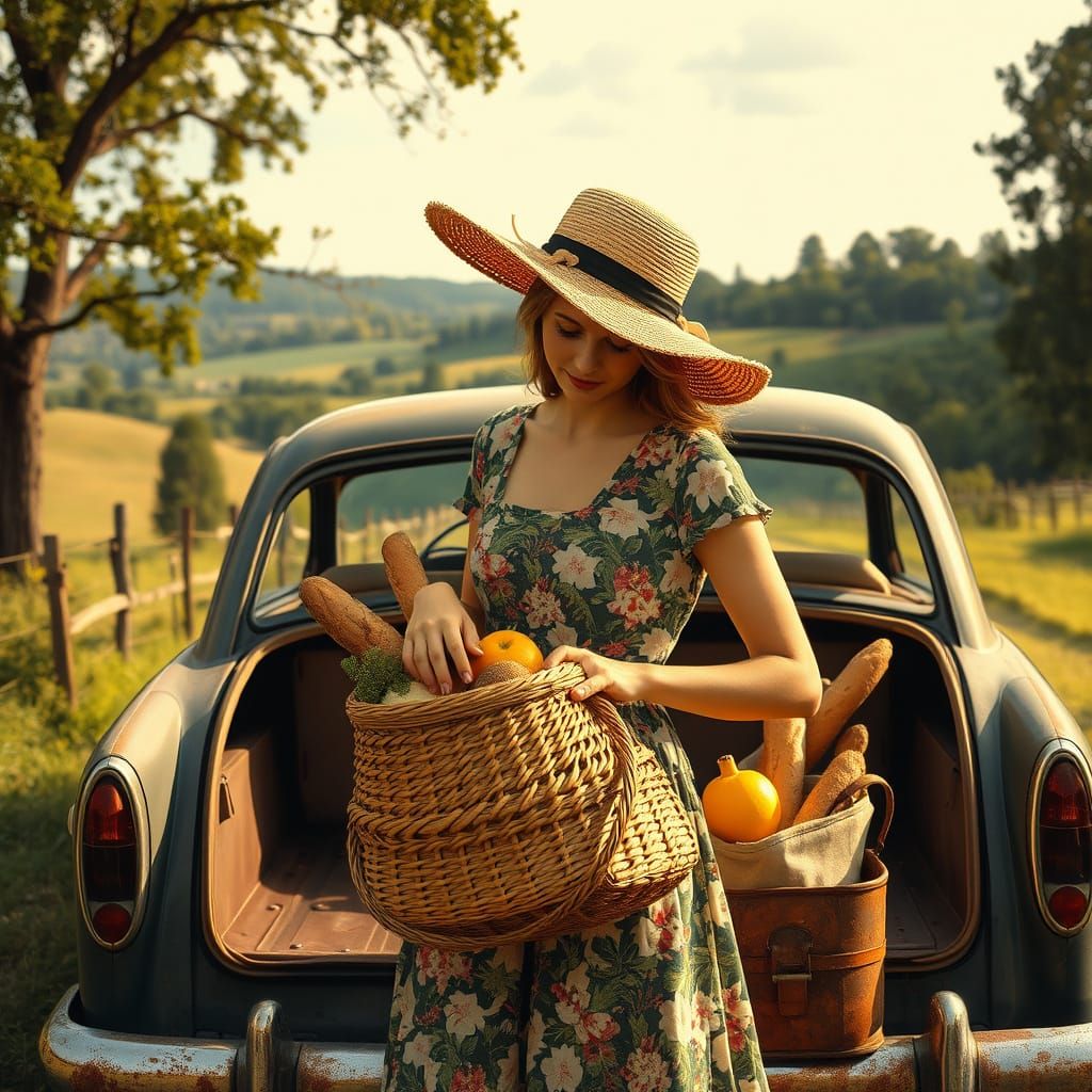 A serene image of a woman loading groceries into her vintage car on a farm. The scene evokes warmth and nostalgia, reminiscent of realist paintings with an earthy color palette.