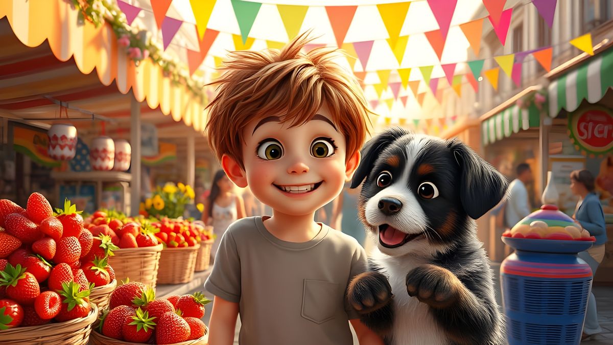 This image shows a vibrant summer market scene filled with colorful stalls, fresh produce, and happy people. A boy, his sister, and a Bernese Mountain Dog puppy are enjoying the festive, hyperrealistic atmosphere in 3D digital art.