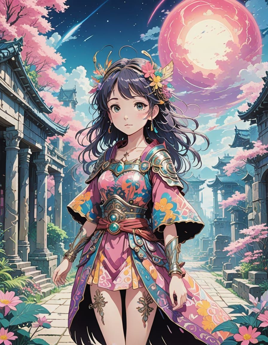 This image shows a close-up of a fairy in a colorful robe and armor amidst the ruins of an ancient civilization. The illustration features vibrant ink colors, hard edges, and intricate details in a style reminiscent of anime and Studio Ghibli.