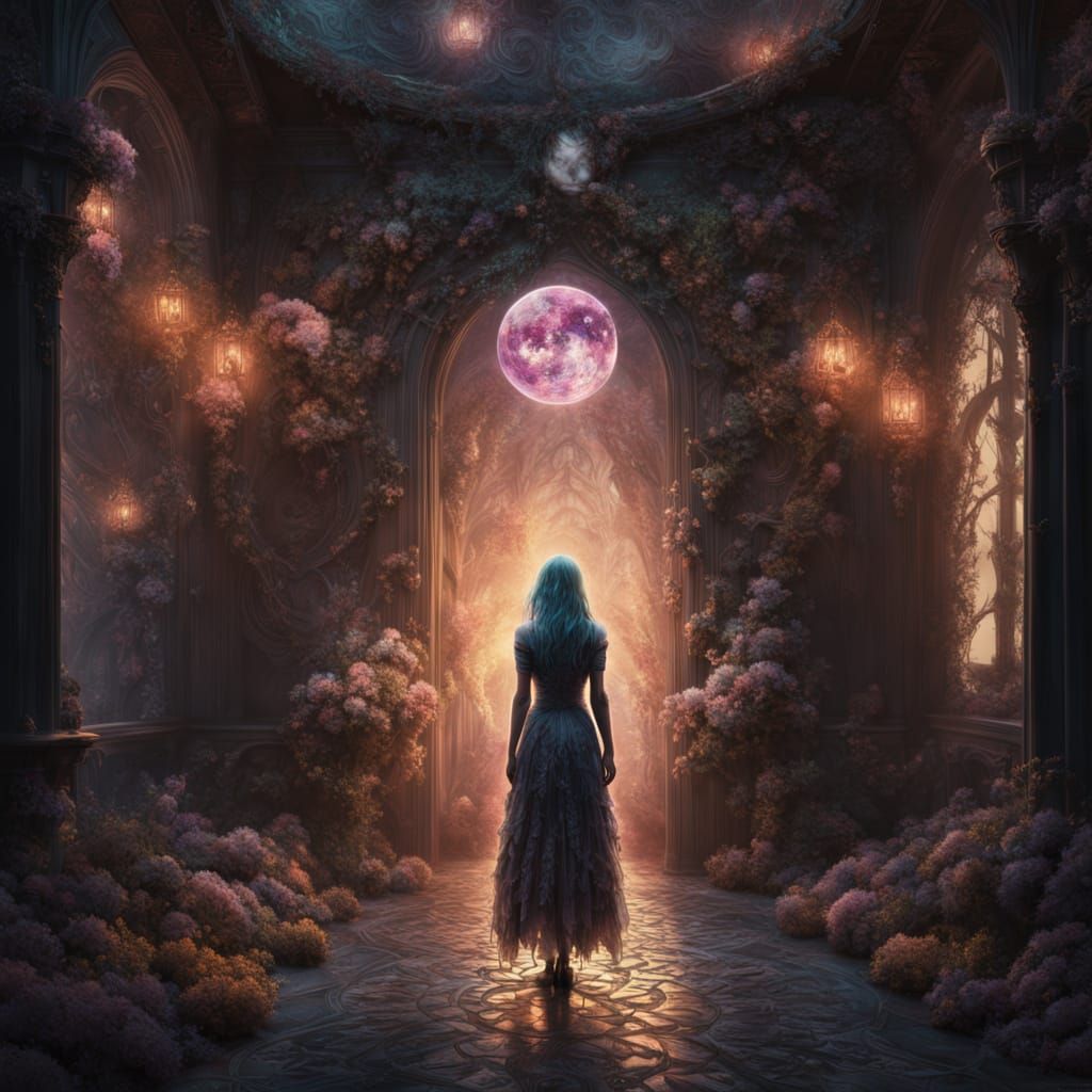 This image depicts a ghostly figure in a dimly lit, Gothic mansion corridor, surrounded by intricate textures and elaborate patterns. The ghost's ethereal outfit glows with an otherworldly energy, set against a dark, rich color palette with touches of vibrant, glowing colors.