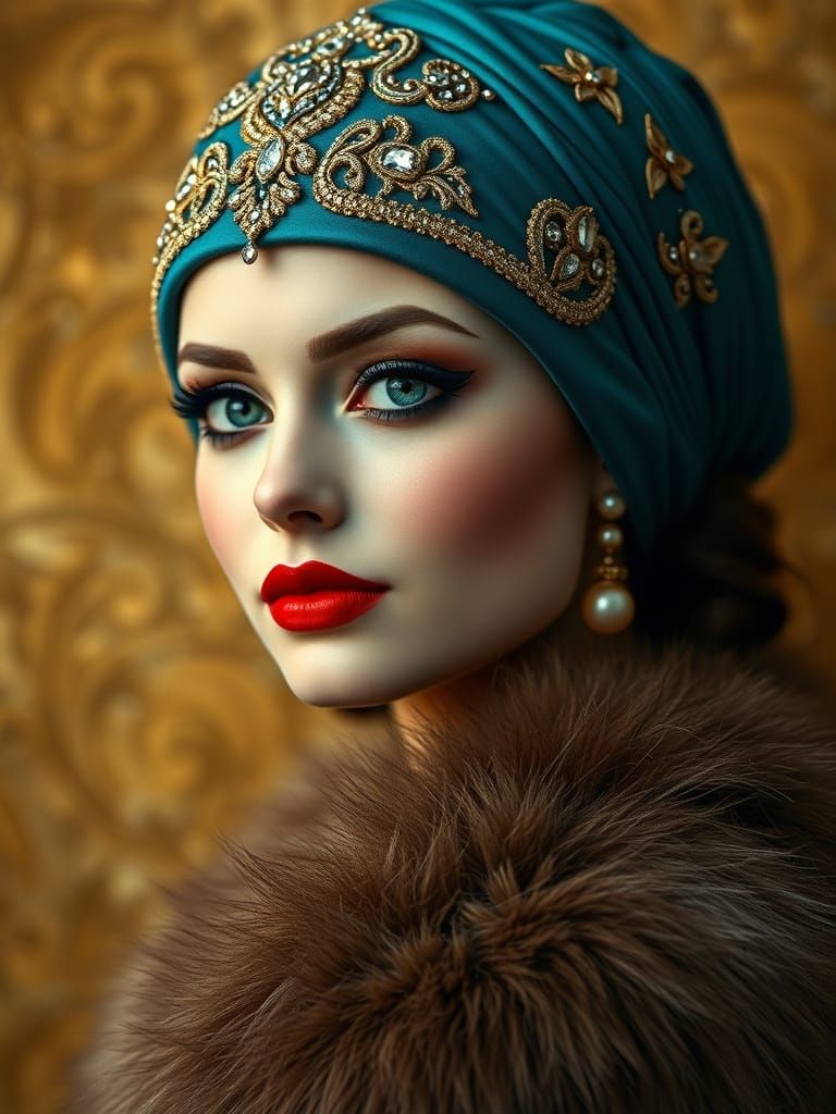 This image shows a stunning woman from the 1920s with piercing blue eyes, dark smoky eyeshadow, and bold red lips. She wears a luxurious coat, opulent headpiece, and textured background evoking a bygone era of glamour and sophistication in the style of Art Deco portraiture.