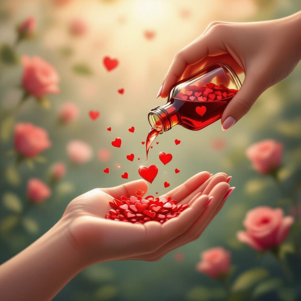 This image shows a surreal scene of red hearts flowing from a tiny bottle onto an open hand, forming heart-shaped kisses. The fantasy art style uses soft pastel colors and warm lighting.