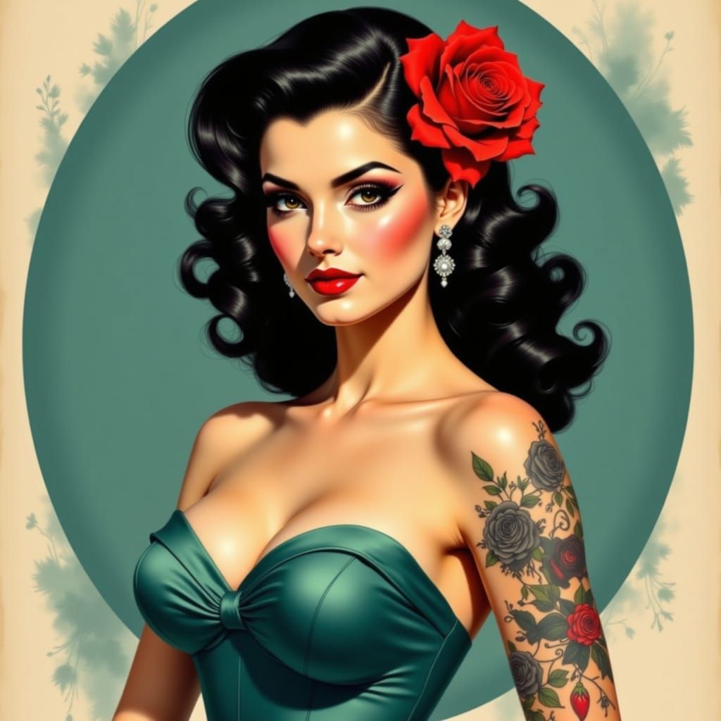 A vintage pin-up woman with black wavy hair, a red rose, and glamorous makeup. She has a tattooed arm and wears a teal dress, posed against a teal background in a retro Hollywood style.