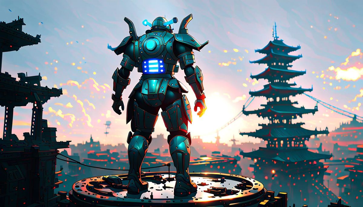 A powerful, armored robot stands watch over a futuristic cityscape at sunset, featuring traditional East Asian architecture.