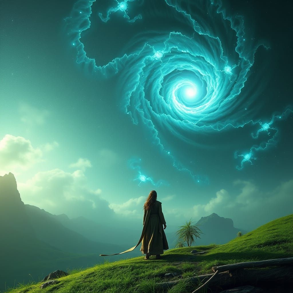 This image shows a shaman gazing at a massive nebula filled with machine elves. The scene is set on a vibrant green landscape with an ethereal glow, rendered in hyperrealistic style with dramatic lighting.