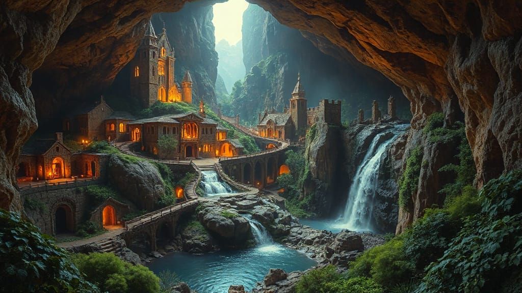 This image shows a detailed fantasy landscape of a lost ancient city within a cavern. Features include waterfalls, rivers, and medieval-fantasy architecture, rendered as an oil painting.