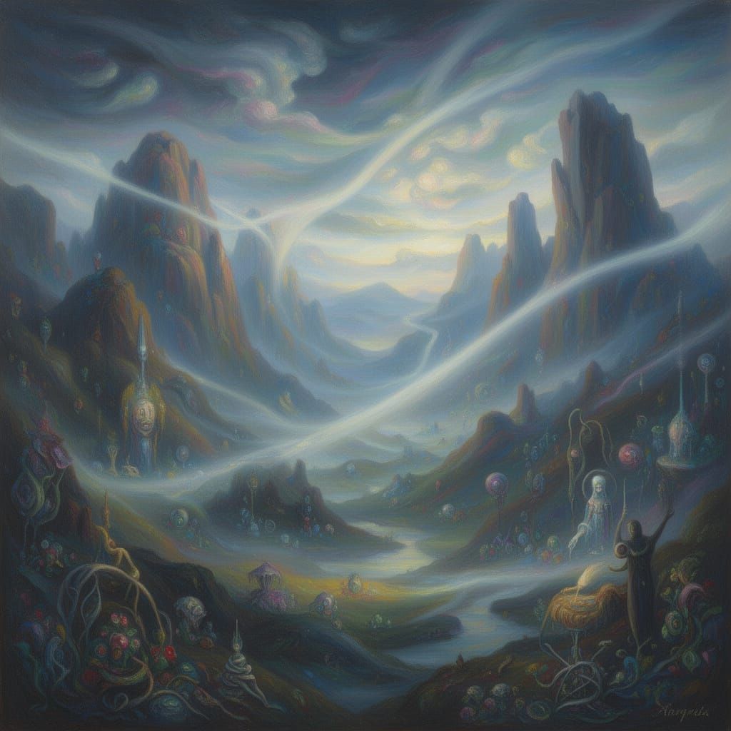 This image depicts a surreal and dreamlike landscape with a sense of profound clarity and emotional intensity. Rendered with soft brushstrokes and luminous, muted colors, it evokes introspection and awe.