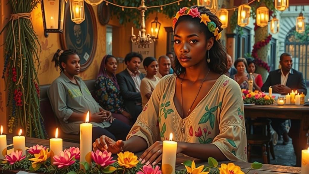 A bright image of a voodoo altar in New Orleans' French Quarter. The scene features candles, string lights, sage, and exotic flowers with bold brushstrokes and vibrant colors.