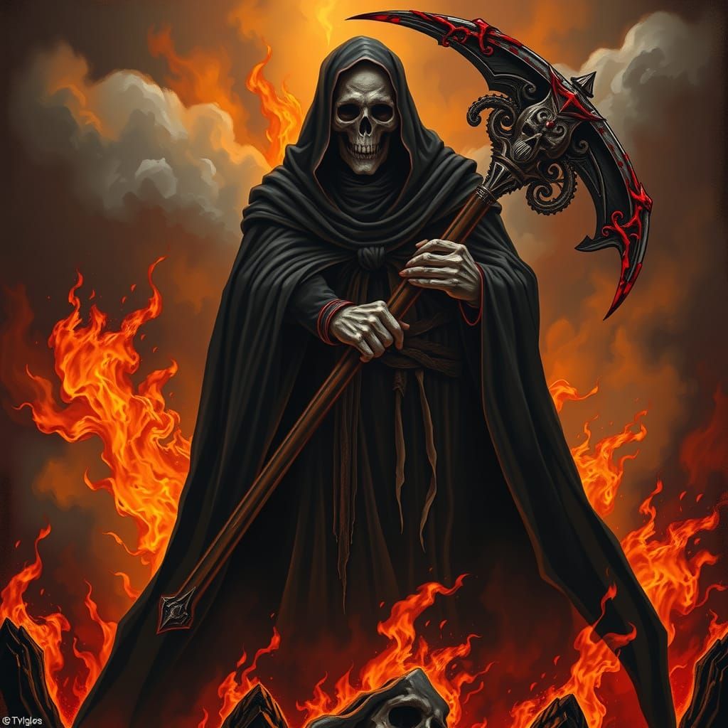 This haunting image depicts a towering Grim Reaper amidst a blazing hell, grasping a blood-soaked scythe with a subtle grin. Rendered in deep contrasting colors, it evokes a sense of dread and foreboding, reminiscent of dark gothic styles and horrorcore themes.