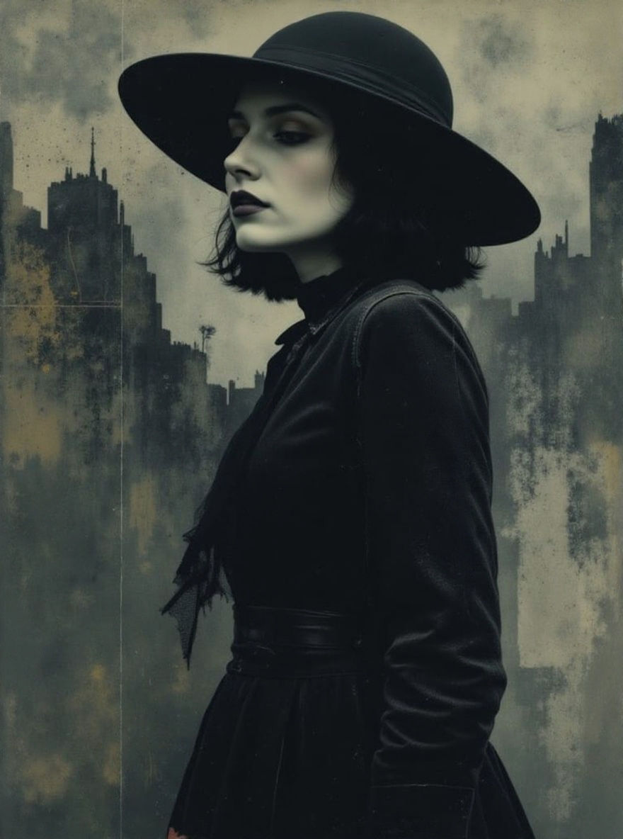 This image shows a portrait of a goth girl with pale skin and dark makeup, framed in gold. The background creates a dark, atmospheric collage in a gothic aesthetic.