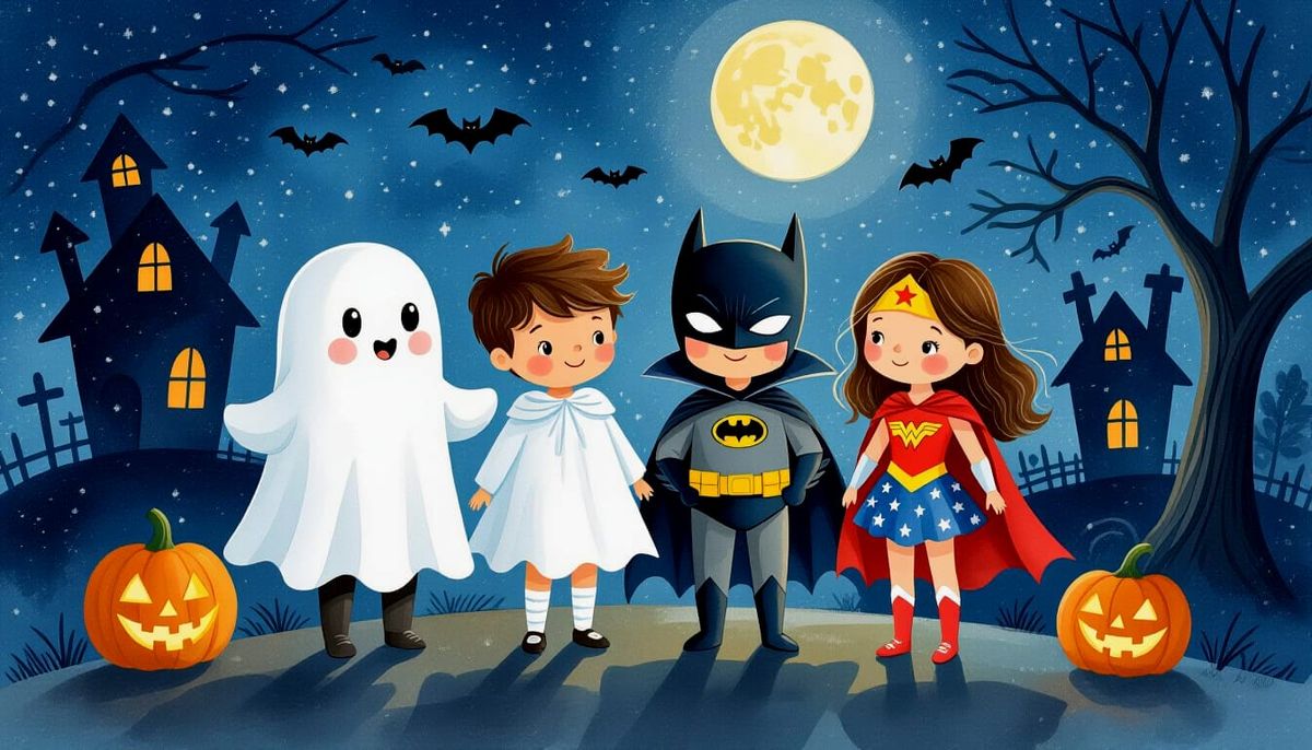 nighttime cute adorable children dressed in a Halloween Ghost, Vampire, Batman and Wonder Woman costume watercolor Steven Belledin Thomas Ki...