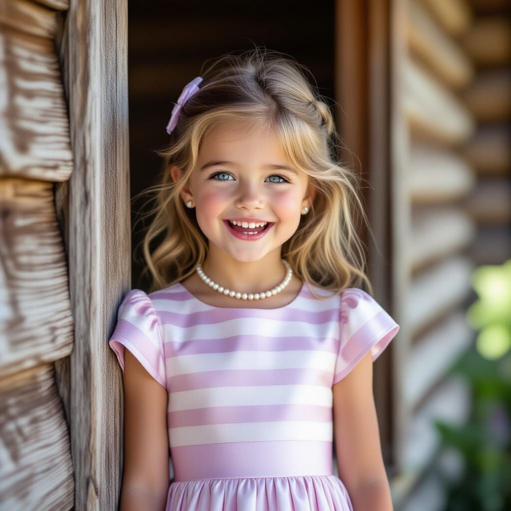 This image shows a smiling French girl in a lilac dress standing outside a wooden cabin. The portrait captures a playful and elegant aesthetic with soft pastel hues.